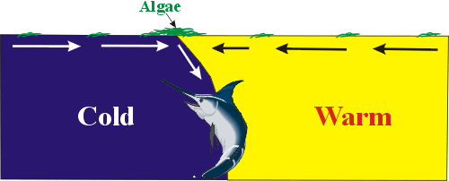 Plankton gathers along temperature boundaries, setting up a food chain that draws bait to the area. NOTE: Plankton tends to concentrate on the cool side of a rip. This is because coastal water has a higher nutrient content and lower salinity level than Gulf Stream core water. The higher nutrient content in coastal water provides plankton with a food source, and the higher salinity level in Gulf Stream water makes this water denser than coastal water, in effect creating a barrier that the floating plankton cannot cross. Because plankton (and the nutrients on which it feeds) clouds the water, sight oriented hunters like marlin and tuna will tend to stay on the warm side of rips.