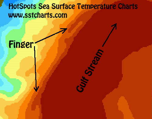 Game fish and bait that have been following the western edge of the Gulf Stream can often be found in fingers, backflows and warm eddies, having moved west with the warm water, avoiding the colder water that gets pulled up between fingers and the Gulf Stream.